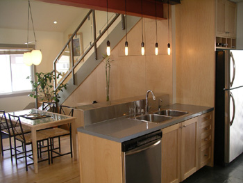 kitchen with stainless steel counter open to dining area, gas fireplace with